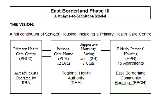 The total EBCH PHASE III project includes a Personal Care Home (PCH), Supportive House/Swing Beds (SH) and Elderly Persons’ Housing (EPH). The EPH building would include affordable single and double bedroom units, as well as a common activity space, and be available to both seniors and disabled persons. It is estimated that approximately 24 new full time jobs, valued at $1 million per year will be created in the R.M. of Piney.